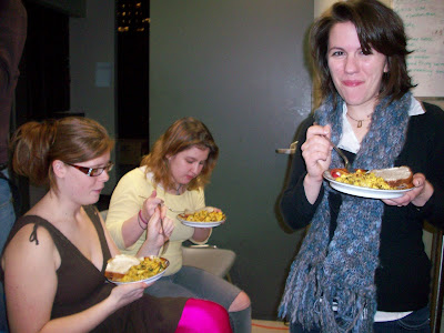 * to press your tofu, remove the tofu from the fridge and package the night before and place it between two plates, or a plate and some flat surface like a cutting board. Then place a weight on top of the second plate/flat surface so it will press down upon the tofu overnight. By morning enough water should have been expelled to reduce the tofu's cooking time and assist it in absorbing flavors. For this recipe, an easier method is to cut the tofu into 6-8 cubes and then squeeze the cubes over the sink until most of the water comes out. It may take a bit of muscle, but you will end up quasi-crumbling the tofu already for the recipe.